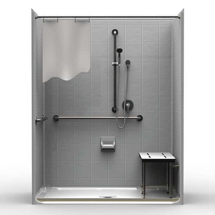 5 piece 63″ x 31″ ADA and California T24 compliant shower with .75 inch threshold and center drain. Fiberglass shower with “Eight Inch Tile” look. Luxurious polyester gelcoat finish. Full plywood backing on all walls for outstanding strength and customized installation of accessories. No mud setting required. Shower stall complies with ADA inside dimensions of 60″ x 30″ for roll-in showers. Seat and grab bar must be installed as shown to meet ADA requirements. All accessories are priced separately. Accessories available: Shower valve, glide bar/hand shower, matching soap dish, seat, grab bars, collapsible water stopper, drain, curtain and rod. Color-White