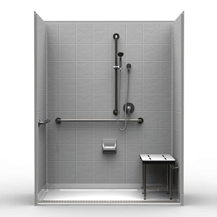 5 piece 63″ x 33″ ADA shower with .75 inch threshold, T threshold, and front trench drain. Fiberglass shower with “Eight Inch” tile look. Luxurious polyester gelcoat finish. Full plywood backing on all walls for outstanding strength and customized installation of accessories. No mud setting required. Shower stall complies with ADA inside dimensions of 60″ x 30″ for roll-in showers. Seat and grab bar must be installed as shown to meet ADA requirements. All accessories are priced separately. Accessories available: Shower valve, glide bar/hand shower, matching soap dish, seat, grab bars, collapsible water stopper, drain, curtain and rod.