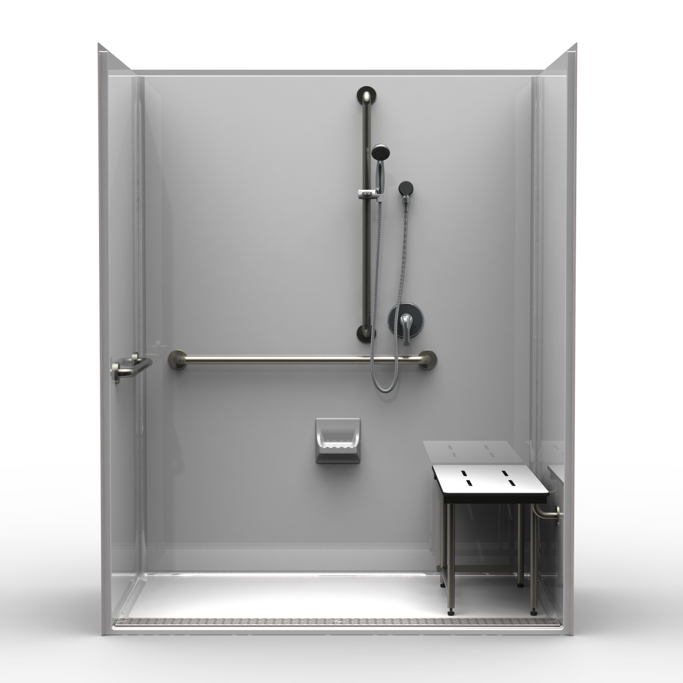 1 piece 63″ x 31″ ADA and California T24 compliant shower with .75 inch threshold, and front trench drain. Fiberglass shower with “Smooth Wall” look. Luxurious polyester gelcoat finish. Full plywood backing on all walls for outstanding strength and customized installation of accessories. No mud setting required. Shower stall complies with ADA inside dimensions of 60″ x 30″ for roll-in showers. Seat and grab bar must be installed as shown to meet ADA requirements. All accessories are priced separately. Accessories available: Shower valve, glide bar/hand shower, matching soap dish, seat, grab bars, collapsible water stopper, drain, curtain and rod. Color-White