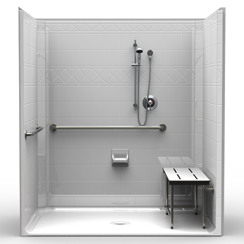 One piece 71″ x 47″ ADA shower with .75 inch threshold and center drain. Fiberglass shower with “Diamond Tile” look. Luxurious polyester gelcoat finish. Custom tile accenting is available. Full plywood backing on all walls for outstanding strength and customized installation of accessories. No mud setting. Shower stall complies with ADA inside dimensions of 60″ x 30″ for roll-in showers. Seat and grab bar must be installed as shown to meet ADA. All accessories are priced separately. Accessories available: Shower valve, glide bar/hand shower, matching soap dish, seat, grab bars, collapsible water stopper, drain, curtain and rod.