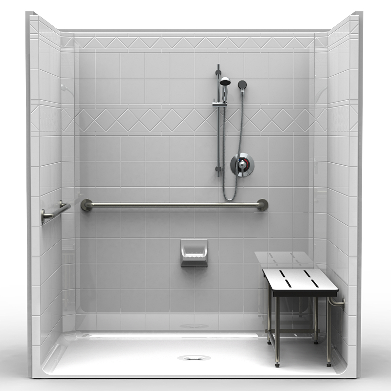 One piece 73″ x 47″ ADA shower with .75 inch threshold and center drain. Fiberglass shower with “Diamond Tile” look. Luxurious polyester gelcoat finish. Custom tile accenting is available. Full plywood backing on all walls for outstanding strength and customized installation of accessories. No mud setting. Shower stall complies with ADA inside dimensions of 60″ x 30″ for roll-in showers. Seat and grab bar must be installed as shown to meet ADA. All accessories are priced separately. Accessories available: Shower valve, glide bar/hand shower, matching soap dish, seat, grab bars, collapsible water stopper, drain, curtain and rod.