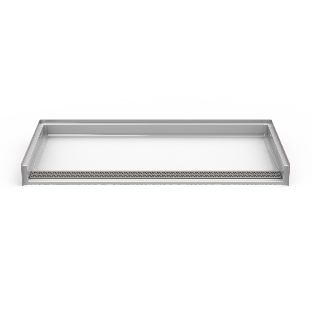 1 piece 63″ x 33″ ADA compliant seamless shower pan with .75 inch beveled threshold, and front trench drain. Luxurious polyester gelcoat finish. With an integral level supported bottom, this shower pan offers exceptional strength. No mud setting required. Shower pan complies with ADA inside dimensions of 60″ x 30″ for roll-in showers. Accessory configurations to meet accessibility guidelines are priced and sold separately.