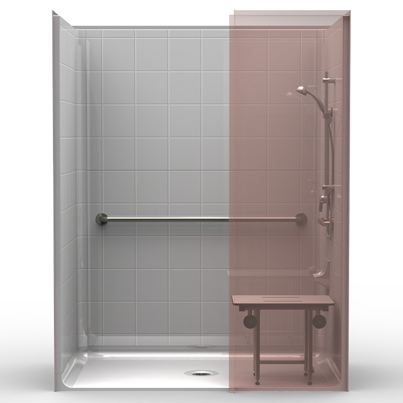 Six piece 63″ x 37″ shower with .75 inch beveled threshold and center drain. Includes wing wall which can be on the right or left hand side. Fiberglass shower with “Eight Inch” tile look. Luxurious gelcoat finish. Full plywood backing on all walls for outstanding strength and customized installation of accessories. All accessories are priced separately. Accessories available: Shower valve, glide bar/hand shower, matching soap dish, seat, grab bars, drain, curtain and rod.