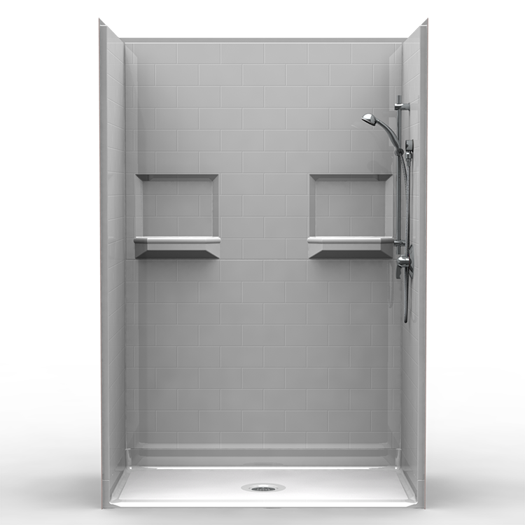 5 piece white NEED IT NOW PACKAGE 54″ x 30″ barrier free shower with .75 inch beveled threshold and center drain. Fiberglass shower with “Subway” tile look. Luxurious polyester gelcoat finish. Full plywood backing on all walls for outstanding strength and customized installation of accessories. No mud setting required. Accessory package includes: 24″ Stainless Steel safety bar, 42″ Stainless Steel safety bar, 22″ x16″ padded seat w/legs, Delta shower valve w/hand held shower system, 2″ caulkless brass drain w/chrome screen, 53.5″ curtain rod /brackets and rings, 62″ x 74″ 20ga vinyl shower curtain, 3″ Flange Trim Kit, and 5′ WaterStopper.