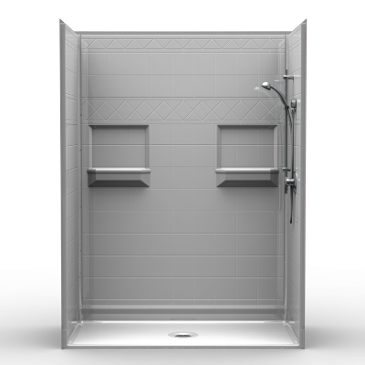 Five piece 60″ x 30″ barrier free shower with .75 inch beveled threshold and center drain. Fiberglass shower with “Diamond” tile look. Luxurious polyester gelcoat finish. Custom tile accenting is available. Full plywood backing on all walls for outstanding strength and customized installation of accessories. No mud setting required. All accessories are priced separately. Accessories available: Shower valve, glide bar/hand shower, matching soap dish, seat, grab bars, collapsible water stopper, drain, curtain and rod.
