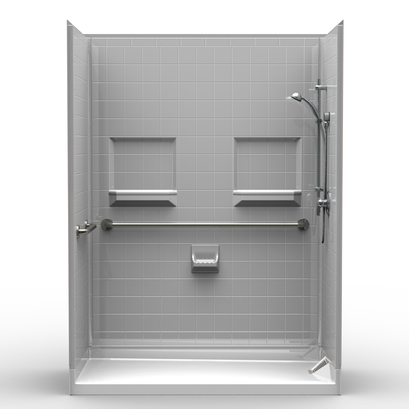 5 piece 60″ x 30″ shower with 2.5 inch traditional threshold, and side outlet drain. Fiberglass shower with “Real” tile look. Luxurious polyester gelcoat finish. Full plywood backing on all walls for outstanding strength and customized installation of accessories. No mud setting required. All accessories are priced separately. Accessories available: Shower valve, glide bar/hand shower, matching soap dish, seat, grab bars, collapsible water stopper, drain, curtain and rod.