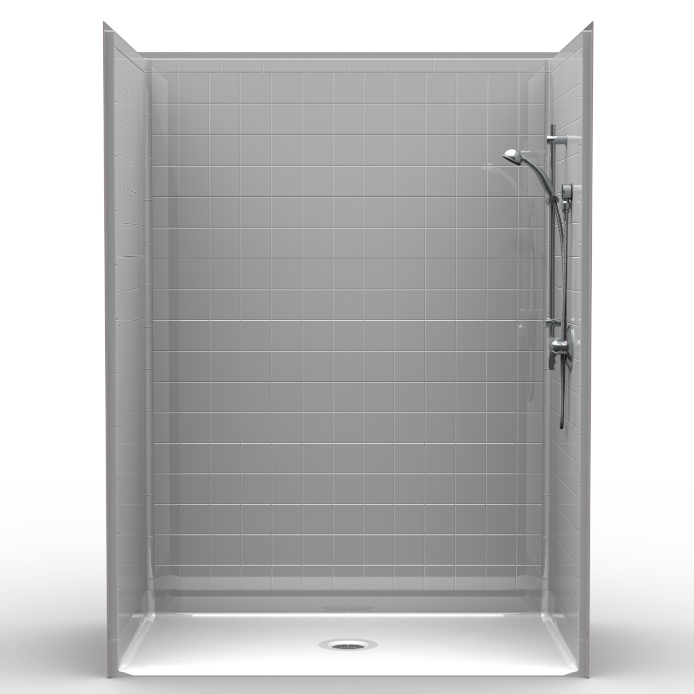 5 piece 60″ x 36″ barrier free shower with .75 inch threshold and center drain. Fiberglass shower with “Real” tile look. Luxurious polyester gelcoat finish. Custom tile accenting is available. Full plywood backing on all walls for outstanding strength and customized installation of accessories. No mud setting required. All accessories are priced separately. Accessories available: Shower valve, glide bar/hand shower, matching soap dish, seat, grab bars, drain, curtain and rod.