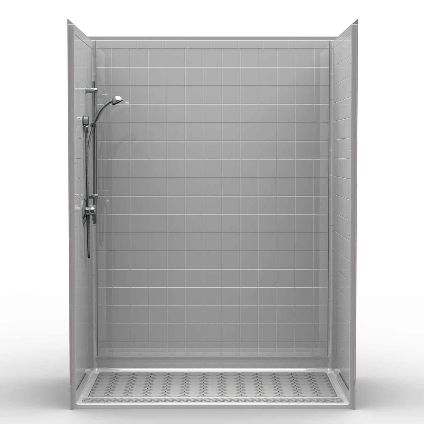 5 piece Designer Series 60″ x 36″ shower with 1″ traditional barrier free threshold, molded recesses in the floor for glass/ceramic tile inlays. Front trench drain with SS grate. Fiberglass shower with “Real Tile” look. Luxurious polyester gelcoat finish. Custom tile accenting is available. Full plywood backing on all walls for outstanding strength and customized installation of accessories. No mud setting required. All accessories are priced separately. Accessories available: Shower valve, glide bar/hand shower, matching soap dish, seat, grab bars, drain, curtain and rod.
