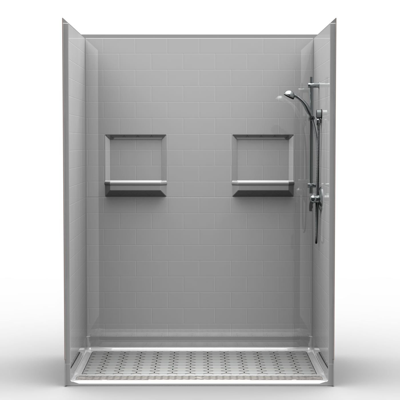 Five piece 60″ x 36″ barrier free shower with 1″ beveled threshold, floor is recessed 3/8″ for tile or stone inlay, front trench drain, and “Subway Tile” — Includes trench drain grate and standard drain assembly. Fiberglass shower with “Real Tile” look. Luxurious polyester gelcoat finish. Custom tile accenting is available. Full plywood backing on all walls for outstanding strength and customized installation of accessories. No mud setting required. Color-White. All accessories are priced separately. Accessories available: Shower valve, glide bar/hand shower, matching soap dish, seat, grab bars, drain, curtain and rod.