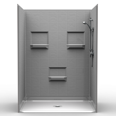 Five piece 60″ x 42″ barrier free shower with 1 inch beveled threshold and center drain. Fiberglass shower with “Eight Inch” tile look. Luxurious polyester gelcoat finish. Custom tile accenting is available. Full plywood backing on all walls for outstanding strength and customized installation of accessories. No mud setting required. All accessories are priced separately. Accessories available: Shower valve, glide bar/hand shower, matching soap dish, seat, grab bars, collapsible water stopper, drain, curtain and rod.