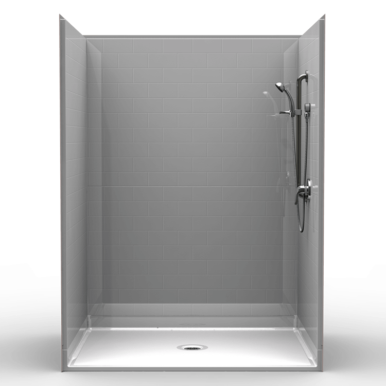 5 piece 60″ x 48″ barrier free shower with .75 inch beveled threshold and center drain. Fiberglass shower with subway tile look and flat back wall. Luxurious polyester gelcoat finish. Custom tile accenting is available. Full plywood backing on all walls for outstanding strength and customized installation of accessories. No mud setting required. All accessories are priced separately. Accessories available: Shower valve, glide bar/hand shower, matching soap dish, seat, grab bars, collapsible water stopper, drain, curtain and rod.