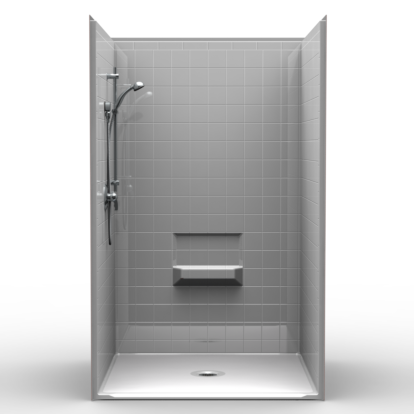 Four piece 48″ x 34″ barrier free shower with .5 inch beveled threshold and center drain. Fiberglass shower with “Real Tile” look. Luxurious polyester gelcoat finish. No mud setting required. All accessories are priced separately. Accessories available: collapsible water stopper & drain.