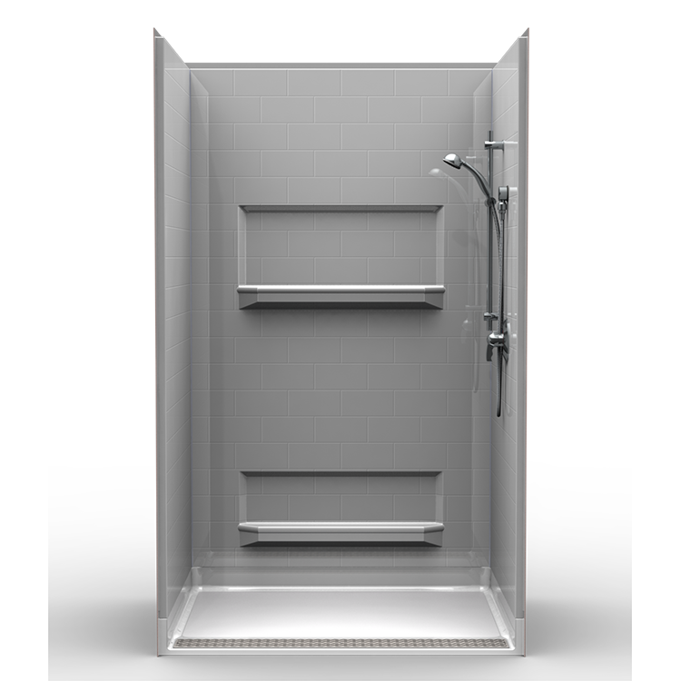 4 piece 48″ x 36″ shower with .75″ beveled barrier free curb. Front trench drain with SS grate. Fiberglass shower with 4×8 “Subway Tile” look. Luxurious polyester gelcoat finish. Custom tile accenting is available. Full plywood backing on all walls for outstanding strength and customized installation of accessories. No mud setting required. All accessories are priced separately. Accessories available: Shower valve, glide bar/hand shower, matching soap dish, seat, grab bars, drain, curtain and rod.
