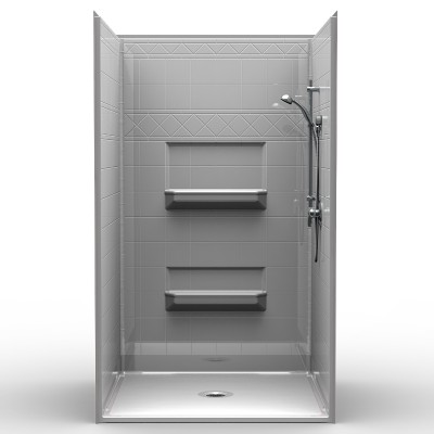 Four piece 48″ x 48″ barrier free shower with 1 inch beveled threshold and center drain. Fiberglass shower with “Diamond” tile look. Luxurious polyester gelcoat finish. Custom tile accenting is available. Full plywood backing on all walls for outstanding strength and customized installation of accessories. No mud setting required. All accessories are priced separately. Accessories available: Shower valve, glide bar/hand shower, matching soap dish, seat, grab bars, collapsible water stopper, drain, curtain and rod.
