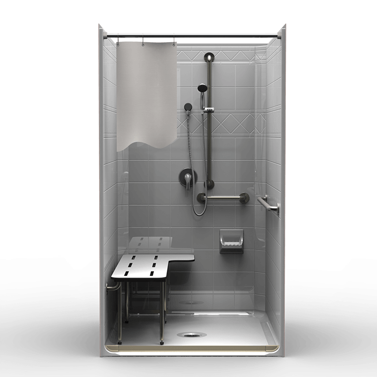 1 piece 44″ x 52″ barrier free shower with .75″ beveled threshold and center drain. Fiberglass shower with “Diamond” tile look. Luxurious polyester gelcoat finish. Custom tile accenting is available. Full plywood backing on all walls for outstanding strength and customized installation of accessories. No mud setting required. All accessories are priced separately. Accessories available: Shower valve, glide bar/hand shower, matching soap dish, seat, grab bars, , drain, curtain and rod. Color-White