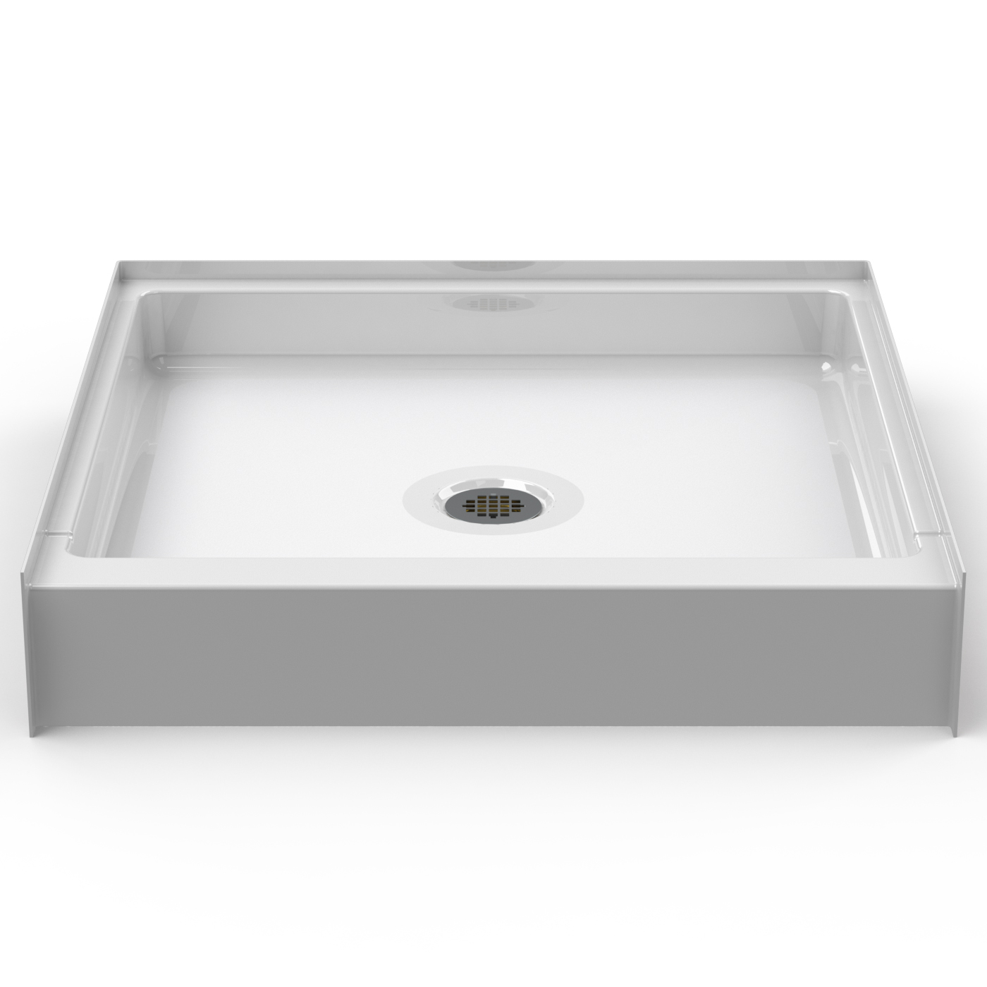 One piece 36″ x 36″ curbed shower pan with 6 inch threshold and center drain. Luxurious polyester gelcoat finish. No mud setting required.