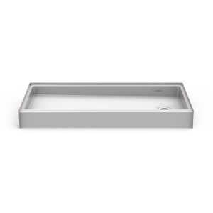 One piece 60″ x 30″ curbed shower pan with 5.75 inch threshold and left or right end drain. Luxurious polyester gelcoat finish. No mud setting required.