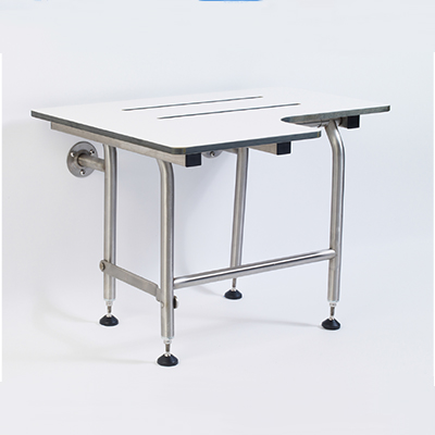 RIGHT Hand Model Shown Folding shower seat frame and legs constructed of type 304 stainless steel Seat top is made of solid phenolic slats 1/2 ” thick and are fire and mildew resistant. Standard Phenolic White and Woodgrain. Custom Phenolic Finishes Available Seat with legs have been designed and tested to 600lbs. of load capacity when properly installed. Custom Sizes Available