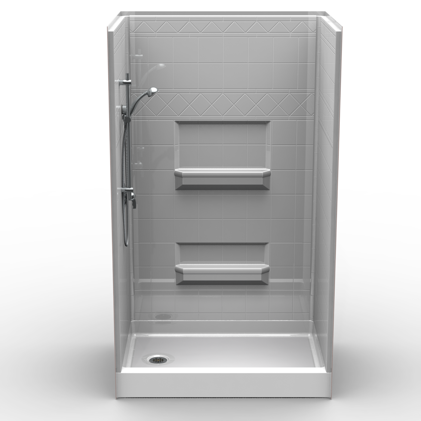 4 piece 48″ x 34″ Shower “Diamond Tile” wall finish with 4″ curb. Luxurious polyester gelcoat finish. Custom tile accenting is available. Full plywood backing on all walls for outstanding strength and customized installation of accessories. No mud setting required.