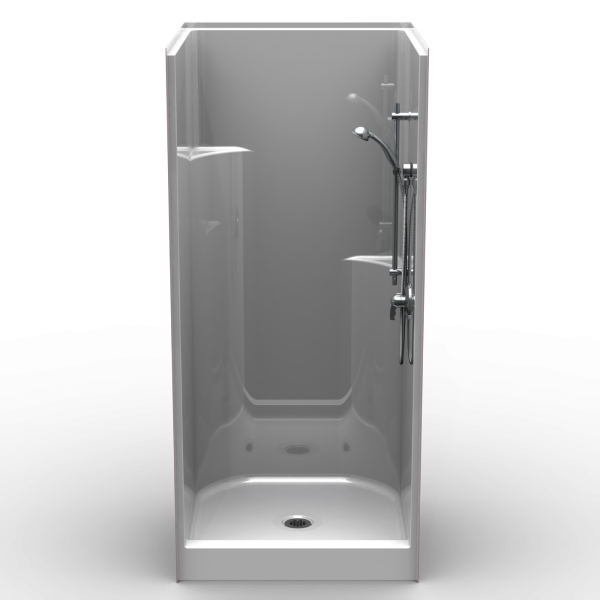 One piece 36″ x 36″ curbed shower with 4 inch threshold and center drain. Fiberglass shower with “Smooth wall” look and molded-in foot rest. Luxurious polyester gelcoat finish. Full plywood backing on all walls for outstanding strength and customized installation of accessories. No mud setting required. All accessories are priced separately. Accessories available: Shower valve, glide bar/hand shower, matching soap dish, grab bars, drain, curtain and rod.
